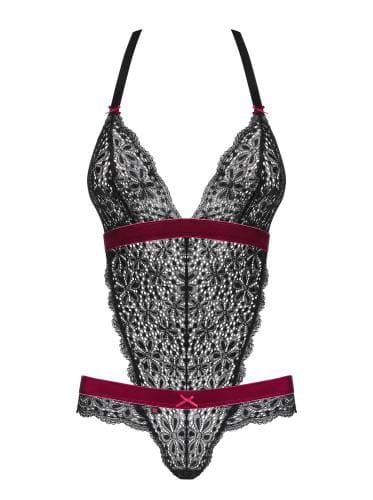 Verras je partner met deze elegante body van Obsessive! Deze body heeft verleidelijk zwart kant en rood fluwelen details. De cups hebben geen beugel en de halternek kun je eenvoudig vaststrikken. Het materiaal is elastisch voor een mooie pasvorm.
